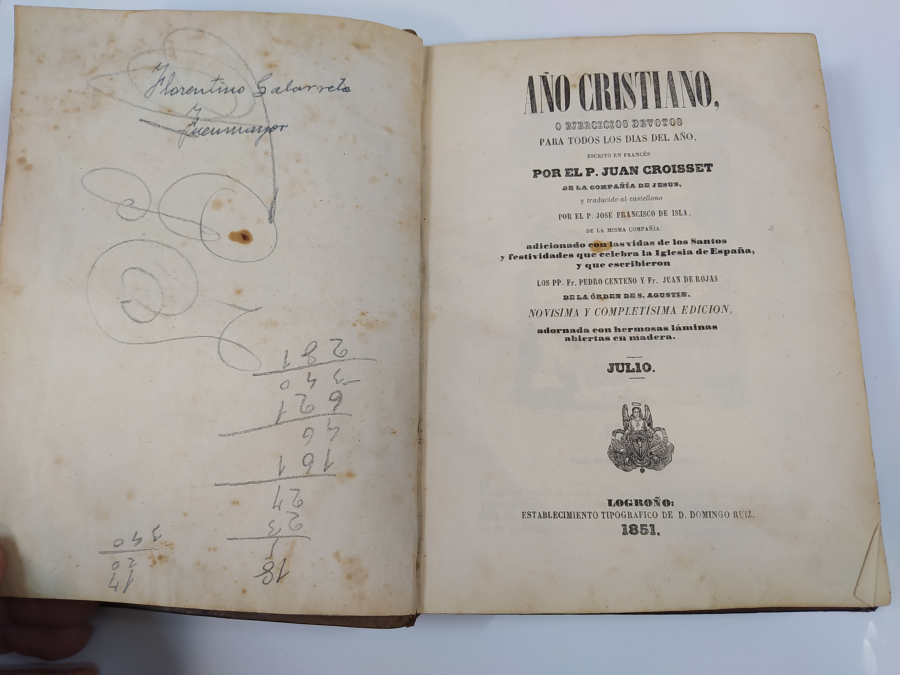 Establecimiento Tipográfico de D. Domingo Ruiz. Logroño 1851. 550 pag. Tapa dura piel. Libro antiguo. Nombre del anterior propietario. Anotaciones en la primera hoja, resto bien.