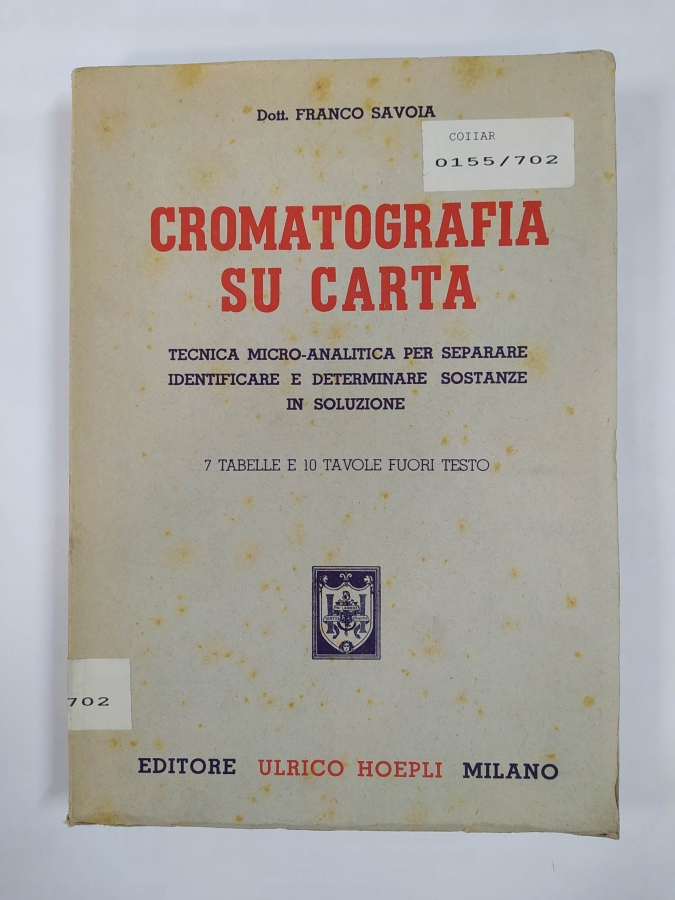 CROMATOGRAFÍA SU CARTA. Tecnica micro-analitica per separare identificare e determinaare sostanze in soluzione. Editore Ulrico Hoepli Milano. Tapa blanda. Italia. 1953. 210 pag + tablas. Ligeros puntos de óxido. Textos en italiano. Etiqueta en lomera, expurgado de biblioteca.