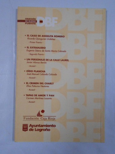 XVI Premio de Narración Breve De Buena Fuente. Ayuntamiento de Logroño. De Buena Fuente, 16. Logroño (La Rioja). 2001. 21 x 14. Rúst. plast. con solapas. Dibujos de Rubén Bergasa. 86 págs. Relatos de: Eugenio Sáenz de Santamaría, Javier Alonso Benito, José Manuel Calzada Calzada, Elías Palacios Nestares, Carmen Martínez Lasanta. Literatura española Relatos La Rioja