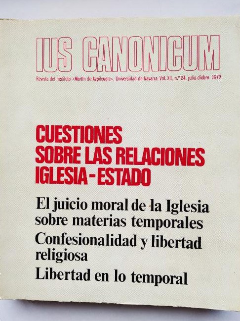 IUS CANONICUM. CUESTIONES SOBRE LAS RELACIONES IGLESIA ESTADO. El juicio moral de la Iglesia sobre materias temporales. Confesionalidad y libertad religiosa. Libertad en lo temporal. Revista del Instituto Martín de Azpilcueta Universidad de Navarra. Vol. XII. Nº 24. Julio a Diciembre 19721961. 368 Pag. EDICIONES UNIVERSIDAD DE NAVARRA. Rústica con solapas.