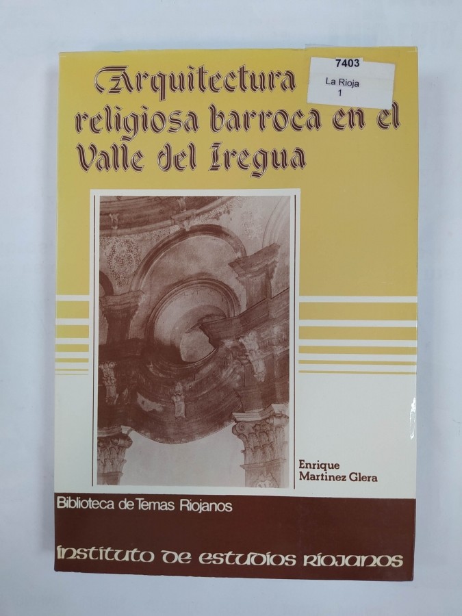ARQUITECTURA RELIGIOSA BARROCA EN EL VALLE DEL IREGUA. 1ª edición. de Martínez Glera, Enrique. Logroño (La Rioja). 1982. Instituto de Estudios Riojanos. IER. Biblioteca de Temas Riojanos, 49. 232 págs. + 55 láms. b/n. 24 x 16. Rúst. plast. con solapas. Etiqueta, expurgado de biblioteca.