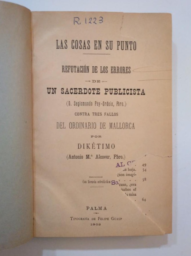 LAS COSAS EN SU PUNTO. REFUTACION DE LOS ERRORES DE UN SACERDOTE PUBLICISTA. Del Ordinario de Mallorca por Dikétimo. Antnio Mª Alcover. Palma de Mallorca. 1902. Tapa dura libro antiguo. Hoja de presentación con recortes, resto muy bien. 536 pag. Libro antiguo, expurgado de biblioteca