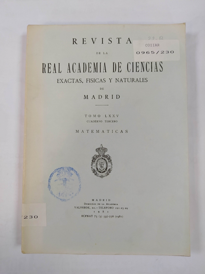 REVISTA DE LA REAL ACADEMIA DE CIENCIAS EXACTAS, FÍSICA Y NATURALES. TOMO LXXV MATEMATICAS. Cuaderno tercero. 1958. Tapa blanda. 540-778 pag. Etiqueta en lomera, expurgado de biblioteca.