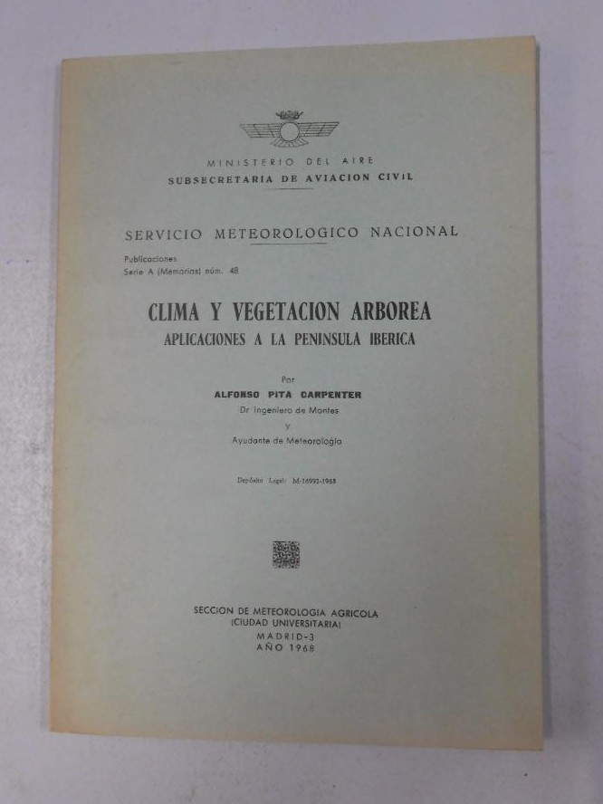 SERVICIO METEOROLOGICO NACIONAL. SUBSECRETARIA DE AVIACION CIVIL. CLIMA Y VEGETACION ARBOREA. APLICACIONES A LA PENINSULA IBERICA. Madrid. año 1968. 40 pag. + mapas y desplegables anexos. bien conservado.