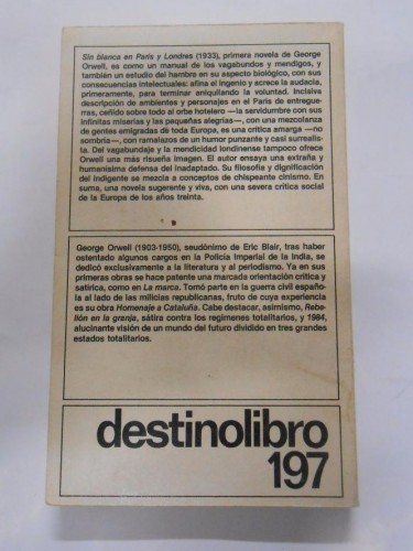 Sin blanca en París y Londres. - Orwell, George. DESTINOLIBRO Nº 197. TDK265